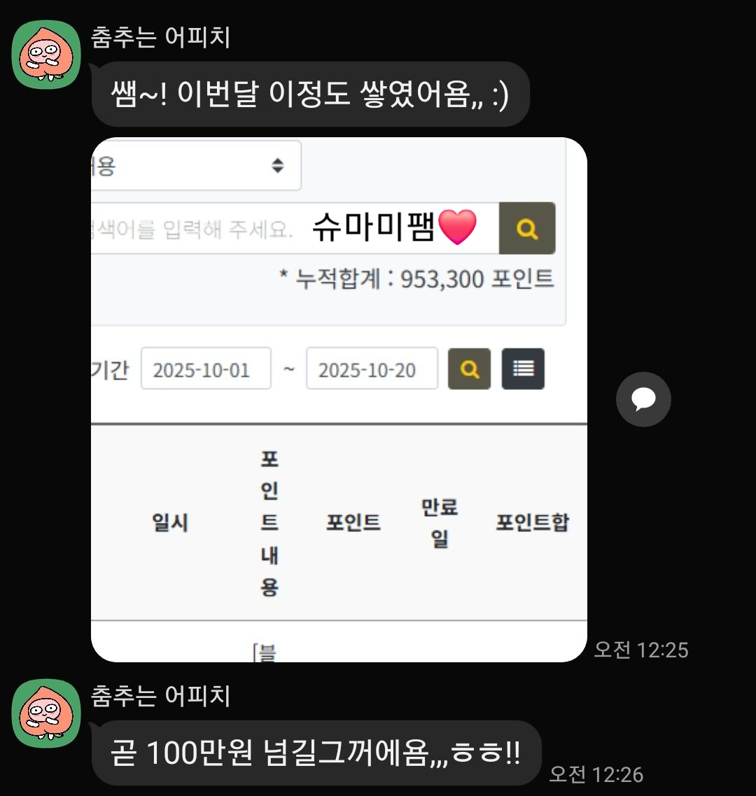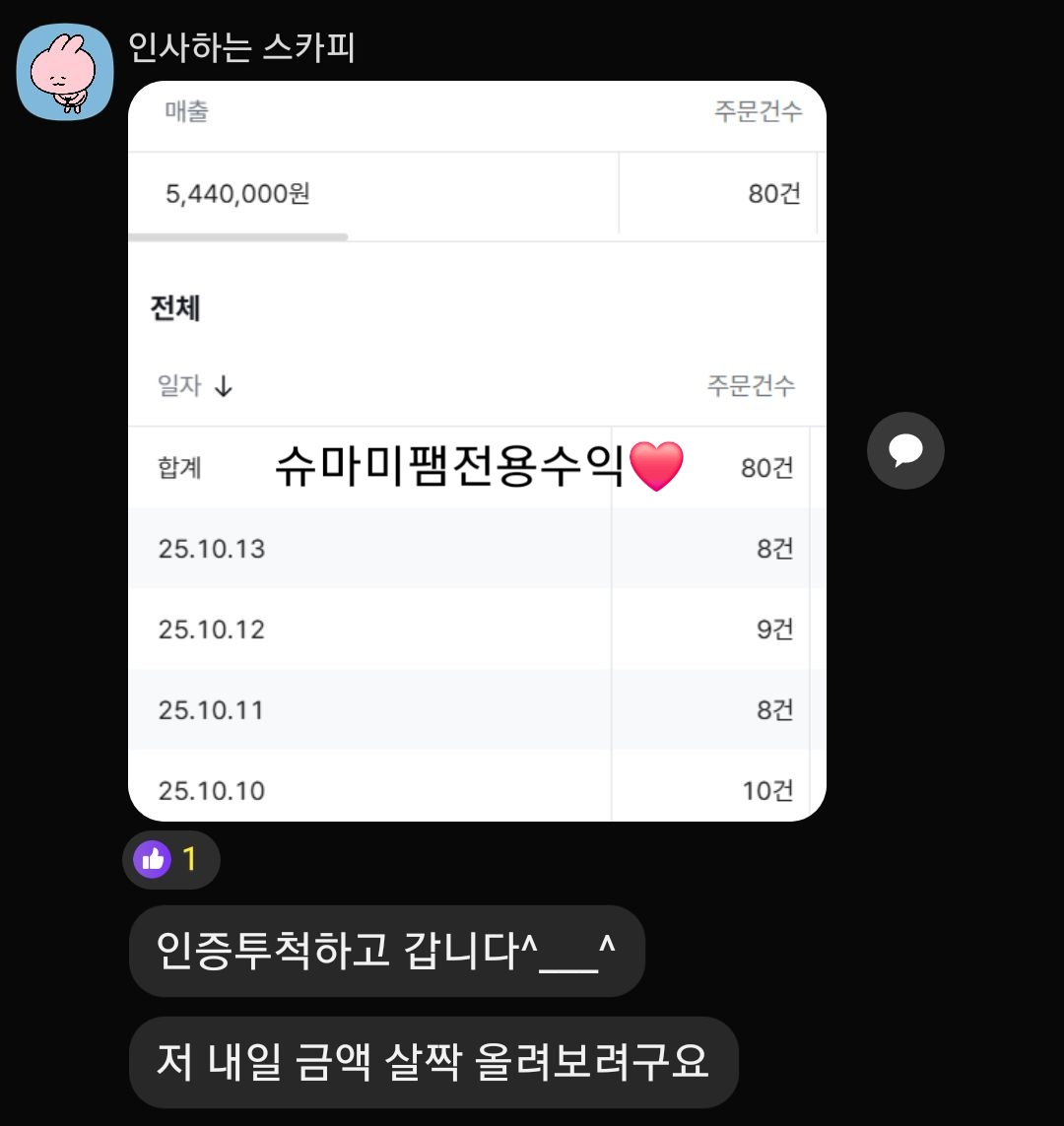 | 슈마미팸이면 못 벌 수가 없지♥ [수익 인증 후기 모음] (0) | 2025.10.15 |